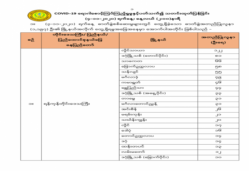 (၃-၁၁-၂၀၂၀) ရက်နေ့ ဓာတ်ခွဲစစ်ဆေးမှုများတွင် တွေ့ရှိခဲ့သော ဓာတ်ခွဲ အတည်ပြုလူနာ (၁,၁၉၇) ဦး၏ မြို့နယ်အလိုက် တွေ့ရှိရမှု အခြေအနေ မှာ အောက်ပါအတိုင်း ဖြစ်ပါသည်။