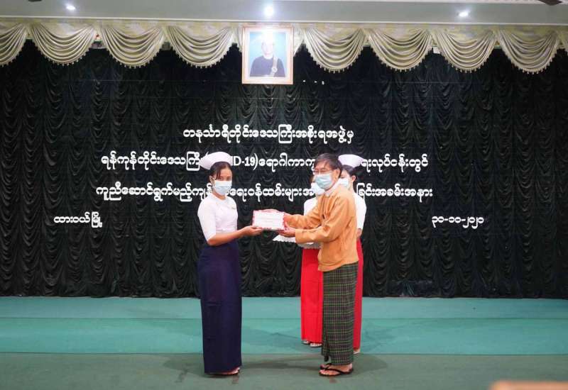 တနင်္သာရီတိုင်းဒေသကြီးအစိုးရအဖွဲ့မှ မြိတ်မြို့နယ် စေတနာ့ဝန်ထမ်း Volunteer များအတွက် ထောက်ပံ့ ငွေကျပ်သိန်း(၂၀)ကို ယနေ့ နံနက်(၉)နာရီခွဲအချိန်ခန့်တွင်က မြိတ်ခရိုင် အထွေထွေအုပ်ချုပ်ရေးဦးစီးဌာန ဧည့်ရိပ်သာ အစည်းအဝေးခန်းမတွင် ဂုဏ်ပြုပေးအပ်ခဲ့သည်။