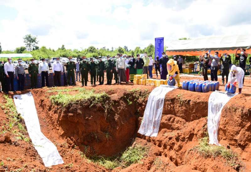 ရှမ်းပြည်နယ်(တောင်ပိုင်း)၊ လွိုင်လင်ခရိုင်၊ ခိုလမ်နယ်မြေရဲစခန်းမှ ဖမ်းဆီးရမိသော မူးယစ်ဆေးဝါးချက်လုပ်ရာတွင် အသုံးပြုမည့် အက်စစ်ပုံးများ ဖျက်ဆီးခြင်းကို ယ‌နေ့ နံနက်(၁၁) နာရီက ခိုလမ်-ကျိုင်းတောင်းကားလမ်းမဘေးတွင် ကျင်းပသည်။