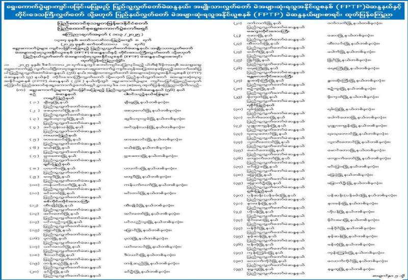 ရွေးကောက်ပွဲများကျင်းပခြင်းမပြုမည့် ပြည်သူ့လွှတ်တော်မဲဆန္ဒနယ်၊ အမျိုးသားလွှတ်တော် မဲအများဆုံးရသူအနိုင်ယူစနစ် (FPTP) မဲဆန္ဒနယ်နှင့် တိုင်းဒေသကြီးလွှတ်တော် သို့မဟုတ် ပြည်နယ်လွှတ်တော် မဲအများဆုံးရသူအနိုင်ယူစနစ် (FPTP) မဲဆန္ဒနယ်များစာရင်း ထုတ်ပြန်ကြေညာ