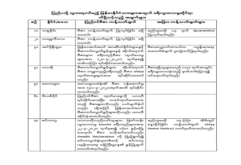 COVID-19 အသက်ရှူလမ်းကြောင်းဆိုင်ရာ ကူးစက်ရောဂါ ပြည်ပမှကူးစက်မှုများ ကာကွယ် တားဆီးရေးအတွက်လည်းကောင်း၊ ခရီးသွားစဉ် မမျှော်လင့်သော ကန့်သတ်ချက်များနှင့် ကြုံတွေ့နိုင်ခြင်းကြောင့်လည်းကောင်း၊ မြန်မာနိုင်ငံသားများအနေဖြင့် ပြည်ပနိုင်ငံများ၊ အထူးသဖြင့် ရောဂါ ကူးစက်မှုမြင့်မားနေသည့်နိုင်ငံများသို့ မလွှဲမရှောင်သာကိစ္စများမှလွဲ၍ ခရီးသွားလာမှုရှောင်ရှားကြပါရန် နိုင်ငံခြားရေးဝန်ကြီးဌာနမှ အကြံပြုထား သည်။