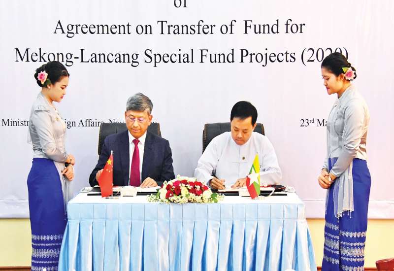 မဲခေါင် - လန်ချန်း ပူးပေါင်းဆောင်ရွက်မှု အထူးရန်ပုံငွေ (၂၀၂၀)ဖြင့် မြန်မာနိုင်ငံ ဝန်ကြီးဌာန (၁၀)ခုမှ အကောင်အထည်ဖော်ဆောင်ရွက်ခွင့်ရရှိသော စီမံကိန်း(၂၂)ခုအတွက် ရန်ပုံငွေ လွှဲပြောင်းလက်ခံလွှာ လက်မှတ်ရေးထိုးပွဲ အခမ်းအနားကို ယနေ့ မွန်းလွဲပိုင်းတွင် နိုင်ငံခြားရေးဝန်ကြီးဌာန၌ ကျင်းပရာ နိုင်ငံခြားရေးဝန်ကြီးဌာန၊ အမြဲတမ်းအတွင်းဝန် ဦးစိုးဟန်နှင့် မြန်မာနိုင်ငံဆိုင်ရာ တရုတ်ပြည်သူ့သမ္မတနိုင်ငံ သံအမတ်ကြီး မစ္စတာချန်းဟိုင်တို့ တက်ရောက် လက်မှတ် ရေးထိုးကြသည်။