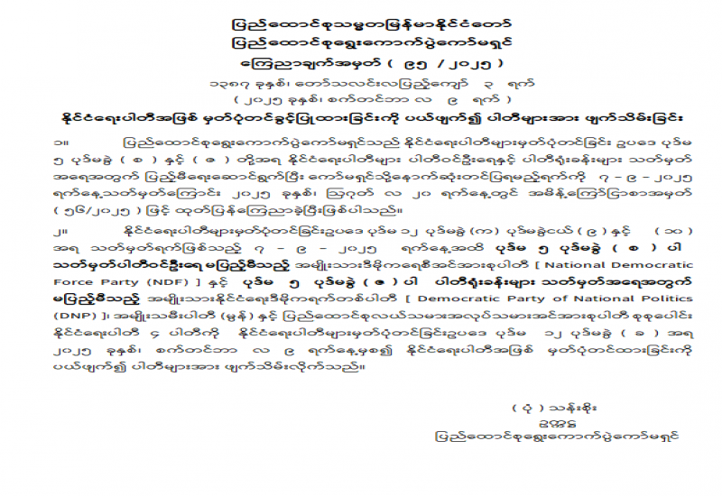 နိုင်ငံရေးပါတီအဖြစ် မှတ်ပုံတင်ခွင့်ပြုထားခြင်းကို ပယ်ဖျက်၍ ပါတီများအား ဖျက်သိမ်းခြင်း