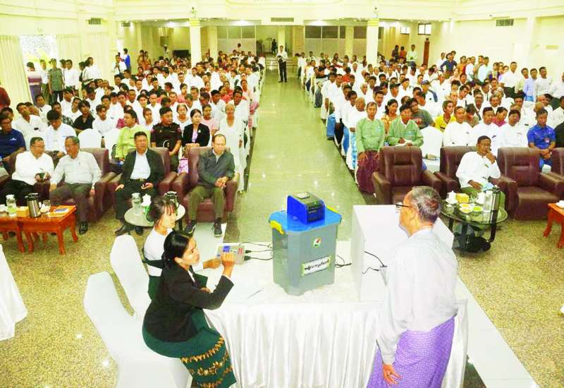 ပြည်ထောင်စုရွေးကောက်ပွဲကော်မရှင်ဥက္ကဋ္ဌ ဦးသန်းစိုးသည် ကော်မရှင်အဖွဲ့ဝင် ဦးအောင်လွင်ဦး၊ ဦးမြင့်ဦး၊ ဦးသန်းအောင်ကျော်၊ တာဝန်ရှိသူများနှင့်အတူ ယနေ့နံနက်ပိုင်းတွင် မဟာအောင်မြေမြို့နယ်၌ မဲဆန္ဒရှင်ပြည်သူများ မြန်မာအီလက်ထရောနစ် မဲပေးစက်(MEVM)ဖြင့် စမ်းသပ်မဲပေးနေမှုကို ကြည့်ရှုပြီး မဲဆန္ဒရှင်များနှင့် တွေ့ဆုံအားပေးစကားပြောကြားသည်။