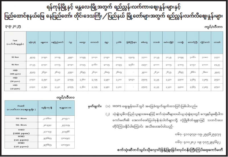 ရန်ကုန်မြို့နှင့် မန္တလေးမြို့အတွက် ရည်ညွှန်းလက်ကားဈေးနှုန်းများနှင့် ပြည်ထောင်စုနယ်မြေ နေပြည်တော်၊ တိုင်းဒေသကြီး/ပြည်နယ် မြို့တော်များအတွက် ရည်ညွှန်းလက်လီဈေးနှုန်းများ