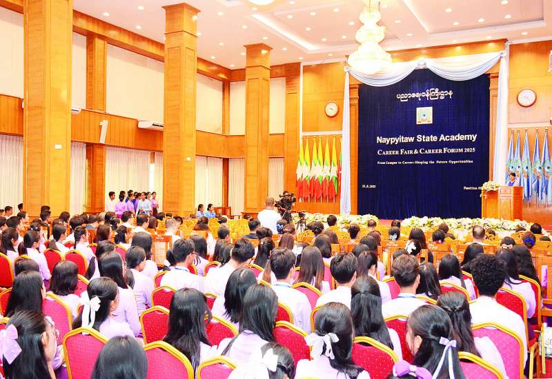 ပထမအကြိမ် Career Fair & Career Forum 2025 ကို ယနေ့ နံနက် ၉ နာရီတွင် Naypyitaw State Academy ၌ ကျင်းပရာ ပညာရေးဝန်ကြီးဌာန ပြည်ထောင်စုဝန်ကြီး ဒေါက်တာချောချောစိန်၊ ဒုတိယဝန်ကြီး ဒေါက်တာဇော်မြင့်နှင့် ဦးနေမျိုးလှိုင်၊ တာဝန်ရှိသူများ၊ ခေတ္တပါမောက္ခချုပ်၊ ဆရာ ဆရာမများ၊ ကျောင်းသား ကျောင်းသူများ၊ လုပ်ငန်းရှင်များနှင့် ဖိတ်ကြားထားသူများ တက်ရောက်ကြသည်။