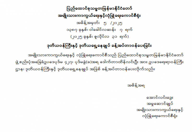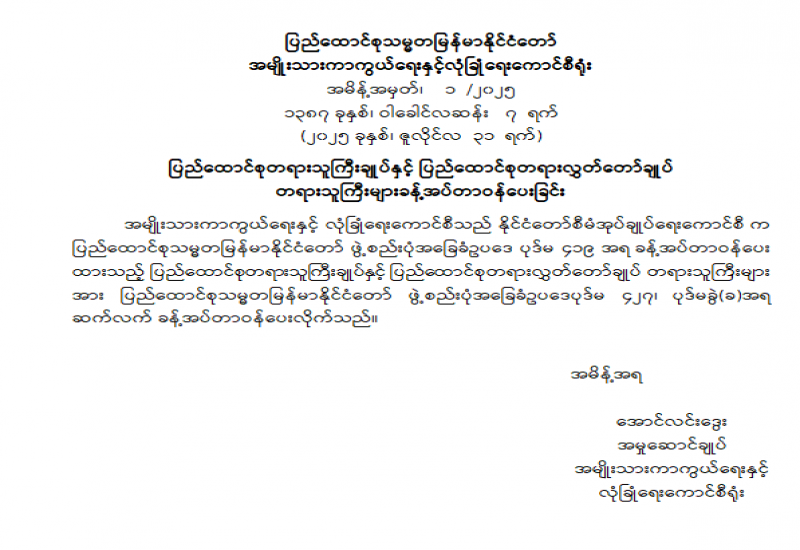 ပြည်ထောင်စုရာထူးဝန်အဖွဲ့ ဥက္ကဋ္ဌနှင့် အဖွဲ့ဝင်များ ခန့်အပ်တာဝန်ပေးခြင်း