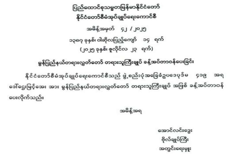 မွန်ပြည်နယ်တရားလွှတ်တော် တရားသူကြီး ခန့်အပ်တာဝန်ပေးခြင်း