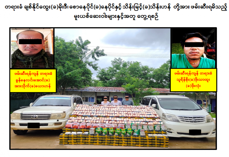 လုံခြုံရေးတပ်ဖွဲ့ဝင်များ ပါဝင်သော ပူးပေါင်းအဖွဲ့သည် ဇူလိုင်လ ၁၁ ရက်နေ့ နံနက် ၈ နာရီခွဲအချိန် လယ်ဝေးမြို့နယ်၊ သစ်ကြိမ်းကျေးရွာအုပ်စု၊ ကြာကန်ကျေးရွာအနီးတွင် အောင်နန်းချိုကျေးရွာဘက်မှ တောင်စဉ်အေးရွာဘက်သို့ စောနေပိုင် (ခ) နေပိုင် မောင်းနှင်လာသော LAND CRUSIER မော်တော်ယာဉ်နှင့် ရှေ့နောက်လိုက်ပါလာသည့် ချစ်နိုင်ထွေး (ခ) မိုးဒီ မောင်းနှင်လာသော ALPHARD မော်တော်ယာဉ်တို့အား စစ်ဆေးရှာဖွေရာ အဆိုပါယာဉ် ၂ စီးပေါ်မှ ဘိန်းဖြူ ၆၇ ဒသမ ၃၃ ကီလို (၎င်းဒေသတန်ဖိုးငွေကျပ် ၁ ဒသမ ၆၈၃၂၅ ဘီလီယံ) ဖမ်းဆီးရမိခဲ့ကြောင်း၊ ကွင်းဆက်ဖော်ထုတ်ချက်အရ အဆိုပါဘိန်းဖြူများအား လက်ခံ၍ မန္တလေးသို့ တာဝန်ခံသယ်ဆောင်သူ သိန်းမြင့် (ခ) သိန်းဟန်သည် တာချီလိတ်ဘက်သို့ တိမ်းရှောင်သွားကြောင်း သိရှိရသဖြင့် ဖော်ထုတ်ဖမ်းဆီးရမိရေး ဆောင်ရွက်ခဲ့ရာ ဇူလိုင်လ ၁၂ ရက်နေ့ နံနက် ၇ နာရီခွဲအချိန်တွင် တာချီလိတ်မြို့၊ ဝမ်ကောင်းရပ်ကွက်၊ ဗိုလ်ချုပ်လမ်းတွင် ဖမ်းဆီးရမိခဲ့ကြောင်း၊
