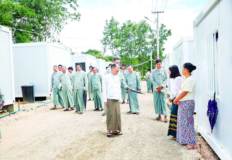 ပြည်ထောင်စုရွေးကောက်ပွဲကော်မရှင်ဥက္ကဋ္ဌ ဦးကိုကို၊ ဒုတိယဥက္ကဋ္ဌ ဦးသန်းစိုးနှင့် အဖွဲ့ဝင်များသည် ယနေ့မွန်းလွဲ ၂ နာရီတွင် ပြည်ထောင်စုရွေးကောက်ပွဲကော်မရှင်ရုံးအနီး ထိန်းသိမ်းဧရိယာ၌ ငလျင်ဘေးသင့် ဝန်ထမ်းအိမ်ထောင်စု ၈၈ စု ယာယီနေထိုင်ရန်အတွက် တပ်ဆင်တည်ဆောက်ပြီးစီးပြီဖြစ်သော အမျိုးသားသဘာဝဘေးအန္တရာယ်ဆိုင်ရာ စီမံခန့်ခွဲမှုကော်မတီက ခွဲဝေချထားပေးသည့် Con-tainer House ၈၈ လုံးသို့ ဝန်ထမ်းများ ပြောင်းရွှေ့နေထိုင်မှုကို သွားရောက်ကြည့်ရှုစစ်ဆေးသည်။