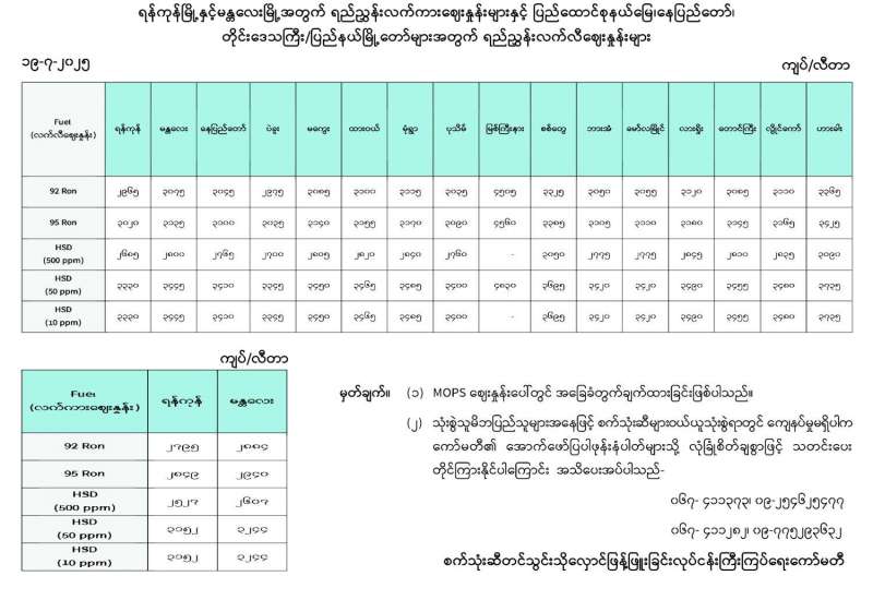 ရန်ကုန်မြို့နှင့် မန္တလေးမြို့အတွက် ရည်ညွှန်းလက်ကားဈေးနှုန်းများနှင့် ပြည်ထောင်စုနယ်မြေ နေပြည်တော်၊ တိုင်းဒေသကြီး/ပြည်နယ် မြို့တော်များအတွက် ရည်ညွှန်းလက်လီဈေးနှုန်းများ