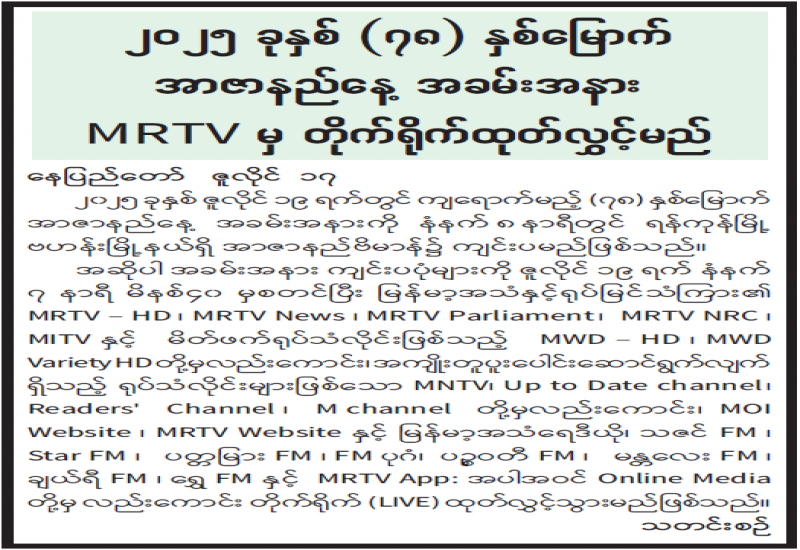 ၂၀၂၅ ခုနှစ် (၇၈) နှစ်မြောက် အာဇာနည်နေ့ အခမ်းအနား MRTV မှ တိုက်ရိုက်ထုတ်လွှင့်မည်