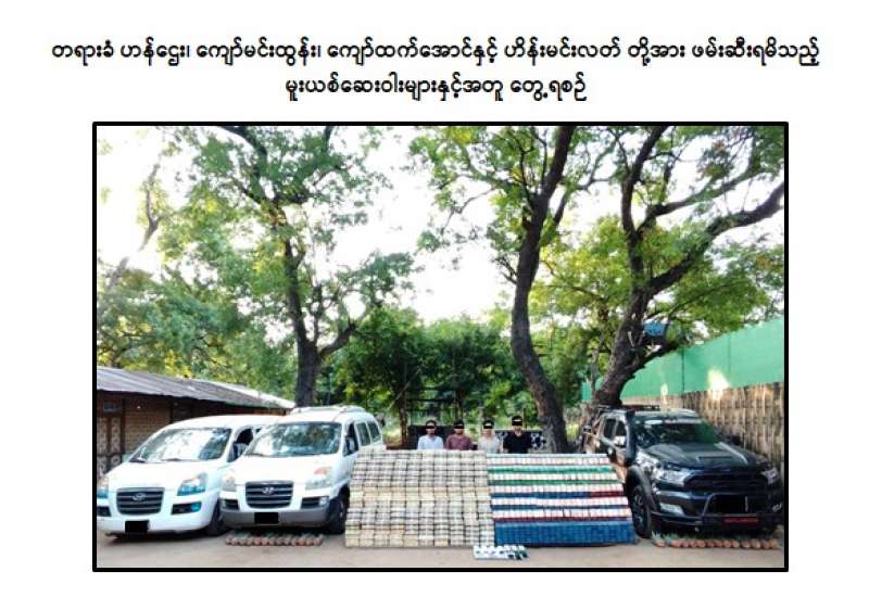 စစ်ကိုင်းတိုင်းဒေသကြီး၊ စစ်ကိုင်းမြို့နှင့် မန္တလေးတိုင်းဒေသကြီး၊ ချမ်းမြသာစည်မြို့နယ်တို့၌ ဇူလိုင် ၇ ရက်နှင့် ၈ ရက်တို့တွင် ငွေကျပ် ၂၀ ဒသမ ၂၂၅ ဘီလီယံတန်ဖိုးရှိ စိတ်ကြွရူးသွပ်ဆေးပြား ၉ သန်းကျော်နှင့် ဘိန်းဖြူ ၂၂ ကီလိုတို့ကို ဖမ်းဆီးရမိခဲ့ကြောင်း မြန်မာနိုင်ငံရဲတပ်ဖွဲ့မှ သိရှိရသည်။