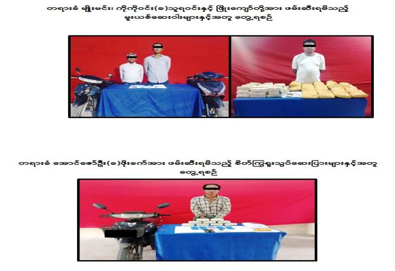 ဇူလိုင်လ ၂ ရက်နေ့ ညနေ ၄ နာရီအချိန် မူးယစ်ဆေးဝါးတားဆီးနှိမ်နင်းရေးရဲတပ်ဖွဲ့မှ တပ်ဖွဲ့ဝင်များ ပါဝင်သောပူးပေါင်းအဖွဲ့သည် သတင်းအရ မန္တလေးတိုင်းဒေသကြီး၊ အောင်မြေသာစံမြို့နယ်၊ ပြည်ကြီးရန်လုံရပ်ကွက်၊ ၁၂ လမ်းအတိုင်း အရှေ့မှအနောက်သို့ ကိုကိုဝင်း(ခ)သူရဝင်း မောင်းနှင်လာသည့် ဆိုင်ကယ်အား စစ်ဆေးရှာဖွေရာ စိတ်ကြွရူးသွပ်ဆေးပြား ၁,၀၀၀ ပြား (တစ်ပြားလျှင် ၂,၀၀၀ ကျပ်နှုန်းဖြင့် ၎င်းဒေသတန်ဖိုးငွေကျပ် သိန်း ၂၀) ဖမ်းဆီးရမိပြီး ကွင်းဆက်ဖော်ထုတ်ချက်အရ ညနေ ၅ နာရီ အချိန်တွင် ချမ်းမြသာစည်မြို့နယ်၊ မဟာအောင်မြေအရှေ့ရပ်ကွက်၊ ၄၀ လမ်းနှင့် ၈၂ လမ်းထောင့်တွင် ဆေးပြားများရောင်းချပေးသူ မျိုးမင်းအား ဆိုင်ကယ်(၁)စီးနှင့်အတူ ဖမ်းဆီးရမိခဲ့ကြောင်း၊ ကွင်းဆက်ဆက်လက်ဖော်ထုတ်ချက်အရ ညနေ ၆ နာရီခွဲ အချိန်တွင် ဆေးပြားများရောင်းချပေးသူ ချမ်းမြသာစည်မြို့နယ်၊ ကျွန်းလုံးဥသျှောင်ရပ်ကွက်နေ ဖြိုးကျော်၏နေအိမ်အား ဝင်ရောက်ရှာဖွေရာ နေအိမ်အတွင်းမှ စိတ်ကြွရူးသွပ်ဆေးပြား ၉၂,၀၀၀ ပြား (တစ်ပြားလျှင် ၂,၀၀၀ ကျပ်နှုန်းဖြင့် ၎င်းဒေသတန်ဖိုးငွေကျပ်သိန်း ၁,၈၄၀)နှင့် ဘိန်းဆီခဲ ၂၇ ကီလို (တစ်ကီလိုလျှင် ငွေကျပ် ၂၅ သိန်းနှုန်းဖြင့် ၎င်းဒေသတန်ဖိုးငွေကျပ် ၆၇၅ သိန်း)တို့အား ဖမ်းဆီးရမိသဖြင့် ကိုကိုဝင်း(ခ)သူရဝင်း(၄၁)နှစ်၊ မျိုးမင်း(၅၀)နှစ်နှင့် ဖြိုးကျော် (၃၁)နှစ်တို့အား မူးယစ်ဆေးဝါးနှင့် စိတ်ကိုပြောင်းလဲစေသောဆေးဝါးများဆိုင်ရာဥပဒေအရ အရေးယူထားကြောင်း သိရှိရသည်။