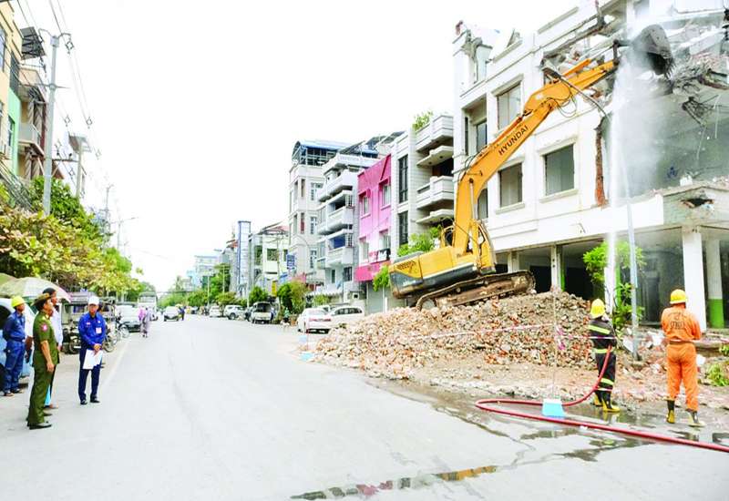အဆောက်အဦများ ပြန်လည်ပြုပြင်အသုံးပြုရေးနှင့် အသစ်တည်ဆောက်ရေးကြီးကြပ်မှုကော်မတီဥက္ကဋ္ဌ နိုင်ငံတော်စီမံအုပ်ချုပ်ရေးကောင်စီအဖွဲ့ဝင် ဒုတိယဝန်ကြီးချုပ်နှင့် ကာကွယ်ရေးဝန်ကြီးဌာန ပြည်ထောင်စုဝန်ကြီး ဗိုလ်ချုပ်ကြီး မောင်မောင်အေးသည် ပြည်ထောင်စုဝန်ကြီး ဦးအောင်ကျော်ဟိုး၊ ဦးမျိုးသန့်၊ နေပြည်တော်ကောင်စီဥက္ကဋ္ဌ ဦးသန်းထွန်းဦးနှင့်အတူ ယနေ့မွန်းလွဲပိုင်းတွင် ငလျင်ဒဏ်ကြောင့် ထိခိုက်ပျက်စီးခဲ့သည့် နိုင်ငံတော်ပိုင်ရုံးအဆောက်အအုံများနှင့် နိုင်ငံတော်ပိုင်ဝန်ထမ်းအိမ်ရာများသို့သွားရောက်၍ အဆောက်အအုံများ ဖြိုချဖျက်သိမ်းခြင်းလုပ်ငန်းများ ဆောင်ရွက်မှုအခြေအနေများကို ကြည့်ရှုစစ်ဆေးသည်။