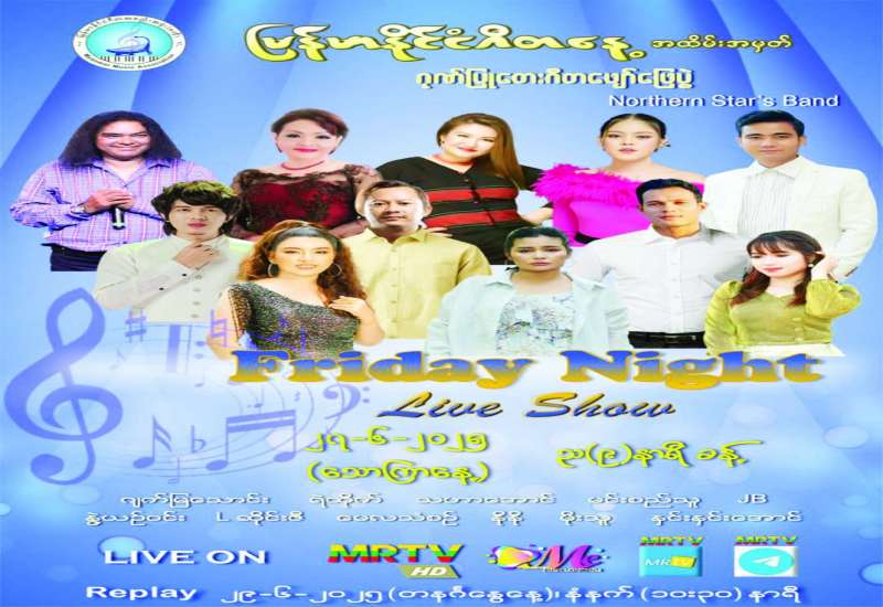 မြန်မာ့အသံနှင့် ရုပ်မြင်သံကြားအနေဖြင့် ပြည်သူများ အပန်းပြေစေရန်နှင့် စိတ်ခွန်အားသစ်များ ရရှိနိုင်ရန် ရည်ရွယ်ပြီး Friday Night Live Show တေးဂီတဖျော်ဖြေပွဲများကို ဆန်းသစ်တင်ဆက်လျက်ရှိရာ “မြန်မာနိုင်ငံဂီတနေ့” အထိမ်းအမှတ် ဂုဏ်ပြုတေးဂီတဖျော်ဖြေပွဲကို ဇွန် ၂၇ ရက် (သောကြာနေ့) ည ၉ နာရီခန့်၌ မြန်မာ့အသံနှင့် ရုပ်မြင်သံကြား၏ MRTV-HD Channel နှင့် MRTV Entertainment Channel တို့မှ တိုက်ရိုက် (Live) ထုတ်လွှင့်ပြသမည်ဖြစ်သည်။