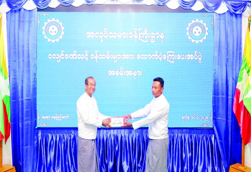 အလုပ်သမားဝန်ကြီးဌာန လက်အောက်ရှိ ဦးစီးဌာန/အဖွဲ့ ရုံးများမှ ငလျင်ဒဏ်သင့်ဝန်ထမ်းများအား ထောက်ပံ့ငွေများ ပေးအပ်ခြင်းအခမ်းအနားကို ယနေ့မွန်းလွဲပိုင်းတွင် အဆိုပါဝန်ကြီး ဌာန၌ကျင်းပရာ ဒုတိယဝန်ကြီး ဦးဝင်းရှိန်၊ အမြဲတမ်းအတွင်းဝန်၊ ညွှန်ကြားရေးမှူးချုပ်များ၊ တာဝန်ရှိသူများနှင့် ငလျင်ဒဏ်သင့် ဝန်ထမ်းများ တက်ရောက်ကြသည်။