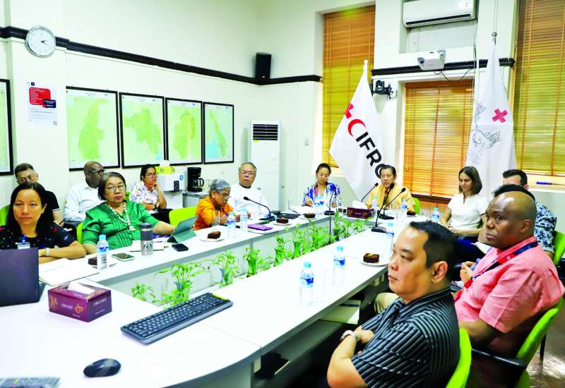 မြန်မာနိုင်ငံ ကြက်ခြေနီအသင်းက ဆောင်ရွက်လျက်ရှိသော ငလျင်တုံ့ပြန်ရေးဆိုင်ရာ Recovery Conference For Myanmar Earthquake ကို ယမန်နေ့မွန်းလွဲပိုင်းက မြန်မာနိုင်ငံကြက်ခြေနီအသင်း ရန်ကုန်ရုံးခွဲတွင် ပြုလုပ်ရာ မြန်မာနိုင်ငံကြက်ခြေနီအသင်းဥက္ကဋ္ဌ ပါမောက္ခဒေါက်တာ မျိုးညွန့်နှင့် အပြည်ပြည်ဆိုင်ရာ ကြက်ခြေနီနှင့် လခြမ်းနီအသင်းများ ဖက်ဒရေးရှင်း (IFRC)မှ Mr. Xavier Castellanos, Under secretary General, National Society Development and Coordination တို့က အမှာစကားပြောကြားသည်။
