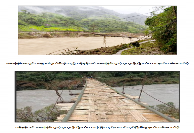 ကချင်ပြည်နယ်အတွင်း မိုးသည်းထန်စွာရွာသွန်းမှုကြောင့် နောင်မွန်းမြို့နယ်၊ နောင်မွန်း - ပန်နန်းဒင်သွား မေခမြစ်ကူး(လူကူး) ကြိုးတံတား အရှည် ၃၄၀ ပေ၊ အကျယ် ၆ ပေသည် မေလ ၃၁ ရက်တွင် မေခမြစ်ရေအဆမတန်မြင့်တက်မှုကြောင့် မြစ်အတွင်းမျောပါသွားခဲ့သည်။ အဆိုပါပန်နန်းဒင် မေခမြစ်ကူး(လူကူး) ကြိုးတံတားပျက်စီးခဲ့မှုအား ဌာနဆိုင်ရာတာဝန်ရှိသူများက အမြန်ဆုံးပြန်လည်ဆောက်လုပ်ခဲ့ရာ ဇွန်လ ၄ ရက်နေ့တွင် ဆောက်လုပ်ပြီးစီး၍ ဒေသခံပြည်သူများ ဖြတ်သန်းသွားလာနိုင်ပြီဖြစ်ကြောင်း သိရှိရသည်။