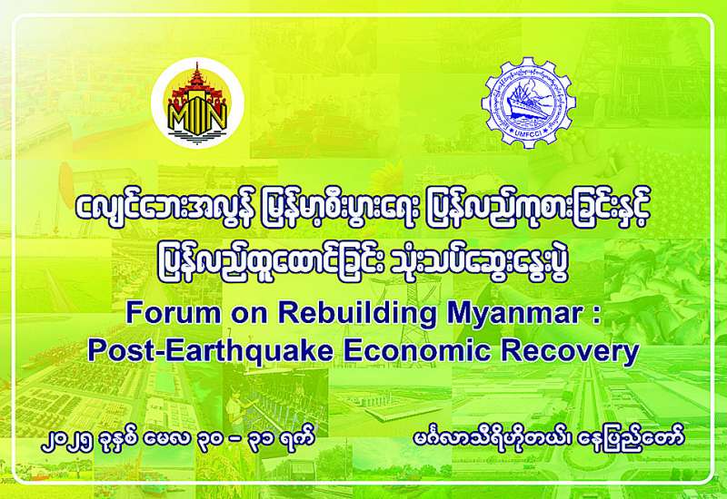 ပြန်ကြားရေးဝန်ကြီးဌာနနှင့် စီးပွားရေးနှင့်ကူးသန်းရောင်းဝယ်ရေးဝန်ကြီးဌာနတို့ ကြီးမှူး၍ မြန်မာ့ပုံရိပ် ဖော်ညွှန်းရေးအဖွဲ့ (Myanmar Narrative Think Tank) က စီစဉ်ကျင်းပသော “ငလျင်ဘေးအလွန် မြန်မာ့စီးပွားရေး ပြန်လည်ကုစားခြင်းနှင့် ပြန်လည်ထူထောင်ခြင်း” (Forum on Rebuilding Myanmar: Post-Earthquake Economic Recovery) သုံးသပ်ဆွေးနွေးပွဲကို မေ ၃၀ ရက်နှင့် ၃၁ ရက်တို့တွင် နေပြည်တော်ရှိ မင်္ဂလာသီရိဟိုတယ်၌ ကျင်းပမည်ဖြစ်သည်။