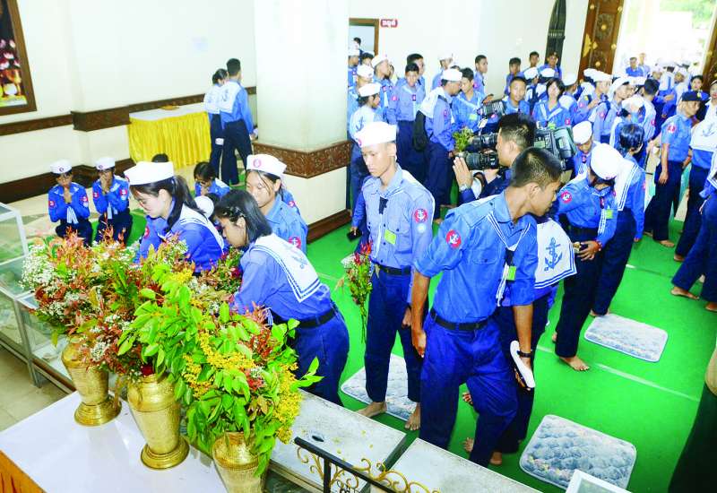 နေပြည်တော်ကောင်စီနယ်မြေသို့ရောက်ရှိနေသော ရေကြောင်းလူငယ်အခြေခံနှင့်တန်းမြင့်သင်တန်း အမှတ်စဉ် (၁/၂၀၂၅) သင်တန်း စခန်း ၁၁ ခုမှ သင်တန်းသား၊ နည်းပြ/အုပ်ချုပ်သူ ၉၂၃ ဦးတို့သည် ယနေ့နံနက်ပိုင်းတွင် သတ္တသတ္တာဟမဟာဗောဓိ စေတီတော်ကြီးနှင့် ဖွား၊ ပွင့်၊ ဟော၊ စံ သံဝေဇနိယလေးဌာနသို့ သွားရောက်လေ့လာဖူးမြော်ကြည်ညိုကြရာ တာဝန်ရှိသူများက လိုက်လံရှင်းလင်းပြသကြသည်။