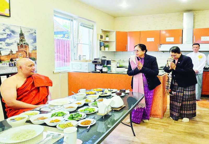 နိုင်ငံတော်စီမံအုပ်ချုပ်ရေးကောင်စီဥက္ကဋ္ဌ နိုင်ငံတော်ဝန်ကြီးချုပ် ဗိုလ်ချုပ်မှူးကြီး မင်းအောင်လှိုင်နှင့်အတူ ရုရှားဖက်ဒရေးရှင်းနိုင်ငံသို့ ရောက်ရှိနေသည့် ဇနီး ဒေါ်ကြူကြူလှသည် ကောင်စီတွဲဖက်အတွင်းရေးမှူး၏ဇနီး ဒေါ်နီလာ၊ ညှိနှိုင်း ကွပ်ကဲရေးမှူး (ကြည်း၊ ရေ၊လေ) ၏ ဇနီး၊ မြန်မာနိုင်ငံ အမျိုးသမီးရေးရာအဖွဲ့ချုပ် ဒုတိယဥက္ကဋ္ဌ ဒေါ်ခင်မေစိုး၊ ရုရှားဖက် ဒရေးရှင်းနိုင်ငံဆိုင်ရာ မြန်မာနိုင်ငံ သံအမတ်ကြီး၏ ဇနီးနှင့် တာဝန်ရှိသူများ လိုက်ပါ၍ ယနေ့ နံနက်ပိုင်းတွင် မော်စကို မြို့ရှိ မြန်မာထေရဝါဒ ဗုဒ္ဓဝိဟာရစင်တာသို့ သွားရောက်သည်။