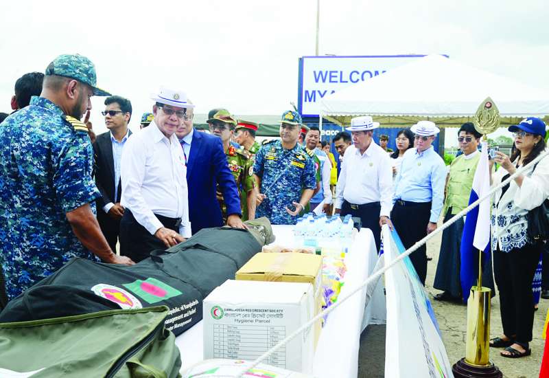 ၂၈.၃.၂၀၂၅ ရက်နေ့က လှုပ်ခတ်ခဲ့သော မန္တလေးမြေငလျင်ကြီးကြောင့် ထိခိုက်ခံစားခဲ့ရသော ငလျင်ဒဏ်ဘေးသင့်ဒေသများအား ကူညီကယ်ဆယ်ရေးနှင့် ပြန်လည်ထူထောင်ရေးလုပ်ငန်းများဆောင်ရွက်ရာတွင် အသုံးပြုနိုင်ရန်အတွက် ဘင်္ဂလားဒေ့ရှ်နိုင်ငံမှ လူသားချင်းစာနာထောက်ထားမှုဆိုင်ရာ အကူအညီများပေးအပ်ရန် ကူညီကယ်ဆယ်ရေးပစ္စည်းများနှင့် စားသောက်ဖွယ်ရာများ တင်ဆောင်လာသော ဘင်္ဂလားဒေ့ရှ်ရေတပ်မှ စစ်ရေယာဉ် BNS SOMUDRA AVIJAN (F-29) သည် ဧပြီလ ၁၁ ရက် မွန်းလွဲပိုင်းတွင် ရန်ကုန်မြို့ရှိ သီလဝါဆိပ်ကမ်း MITT တံတားသို့ ရောက်ရှိလာရာ တပ်မတော်(ရေ)မှ အရာရှိကြီးများ၊ မြန်မာနိုင်ငံဆိုင်ရာ ဘင်္ဂလားဒေ့ရှ်စစ်သံမှူး General Md Aftab Hossain နှင့်တာဝန်ရှိသူများက ကြိုဆိုနှုတ်ဆက်ကြသည်။