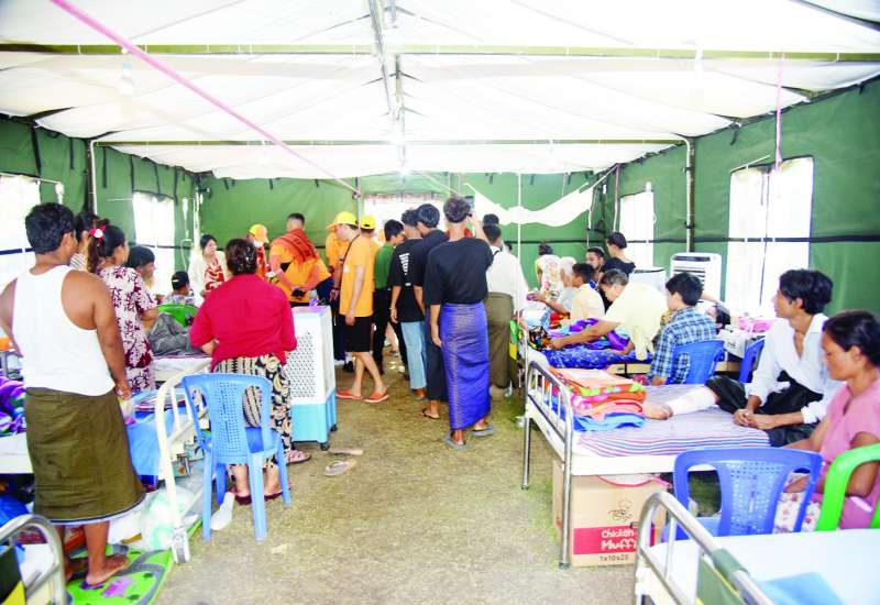 ငလျင်ဘေးဒဏ်သင့်ပြည်သူများအား ဆေးဝါးကုသပေးရန်အတွက် ရောက်ရှိနေသည့် ဘူတန်ဘုရင့်နိုင်ငံမှ ဆေးဘက်ဆိုင်ရာ အရေးပေါ်ကယ်ဆယ်ရေးအဖွဲ့သည် ပြည်ထောင်စုနယ်မြေ နေပြည်တော် ပျဉ်းမနားမြို့ ပေါင်းလောင်းအားကစားကွင်း၌ ဖွင့်လှစ်ထားသည့် ယာယီဆေးရုံ(ပေါင်းလောင်း)၌ တပ်မတော်ဆေးဝန်ထမ်းတပ်ဖွဲ့နှင့် ကျန်းမာရေးဝန်ကြီးဌာနတို့မှ ပါရဂူကြီးများ၊ ဆရာဝန်၊ သူနာပြုများနှင့်ပူးပေါင်း၍ ငလျင်ဘေးဒဏ်သင့်ပြည်သူများအား ဆေးဝါးကုသပေးလျက်ရှိသည်။