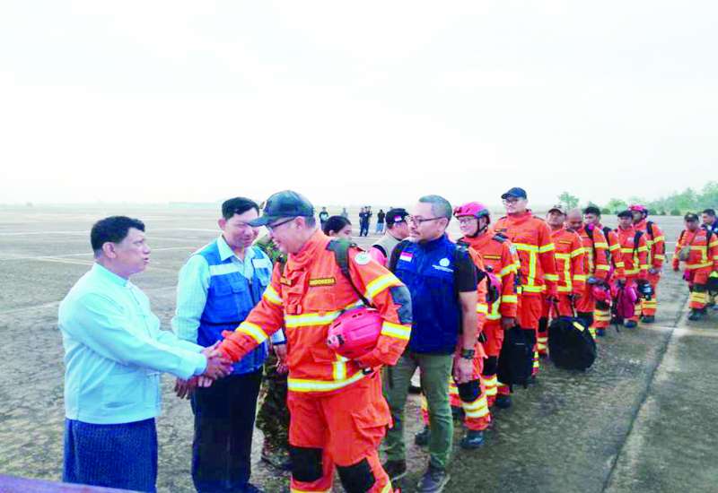 မန္တလေးမြေငလျင်ကြီးကြောင့် ထိခိုက်ခံစားခဲ့ရသည့် ငလျင်ဒဏ်ဘေးသင့်ဒေသများအား ကူညီကယ်ဆယ်ရေးလုပ်ငန်းများဆောင်ရွက်ခဲ့သည့် အင်ဒိုနီးရှားနိုင်ငံမှ ကယ်ဆယ်ရေးအဖွဲ့ဝင်များသည် ၎င်းတို့၏ လုပ်ငန်းတာဝန်များ ပြီးမြောက်ပြီဖြစ်သဖြင့် ယနေ့နံနက်ပိုင်းတွင် မြန်မာနိုင်ငံမှ ပြန်လည်ထွက်ခွာကြရာ အမျိုးသားသဘာဝဘေးအန္တရာယ်ဆိုင်ရာ စီမံခန့်ခွဲမှုကော်မတီကိုယ်စား တာဝန်ရှိသူများက နေပြည်တော်ရှိ တပ်မတော်လေဆိပ်၌ ပို့ဆောင်နှုတ်ဆက်ကြသည်။