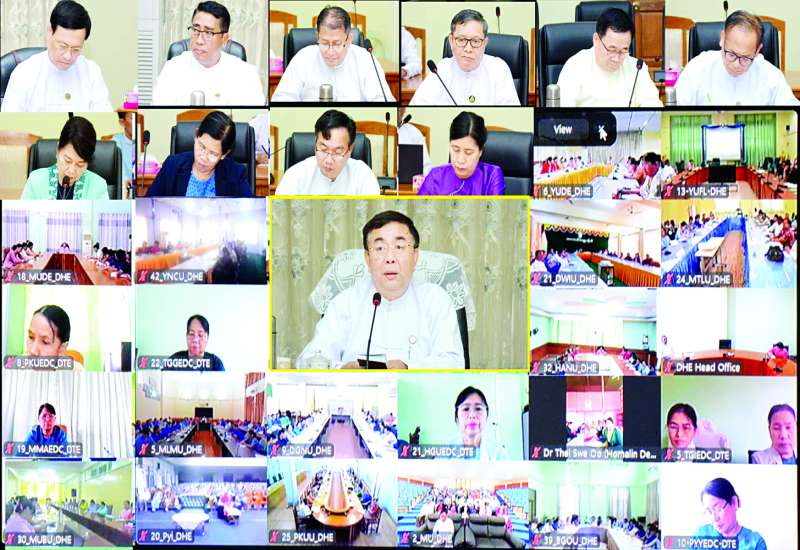 ပညာရေးဝန်ကြီးဌာန ပြည်ထောင်စုဝန်ကြီး ဒေါက်တာညွန့်ဖေသည် တက္ကသိုလ်ပါမောက္ခချုပ်များ၊ ပညာရေးဒီဂရီကောလိပ် ကျောင်းအုပ်ကြီးများ၊ တိုင်းဒေသကြီးနှင့် ပြည်နယ်ပညာရေးမှူးများနှင့် တွေ့ဆုံပွဲကို ယနေ့မွန်းလွဲပိုင်းတွင် နေပြည်တော်ပညာရေးဝန်ကြီးဌာန ရုံးအမှတ်(၁၃)ရှိ အစည်းအဝေးခန်းမ၌ ကျင်းပရာ ဒုတိယဝန်ကြီးများဖြစ်ကြသည့် ဒေါက်တာဇော်မြင့်နှင့် ဦးနေမျိုးလှိုင်၊ ဦးစီးဌာနများမှ ညွှန်ကြားရေးမှူးချုပ်များ၊ ဒုတိယညွှန်ကြားရေးမှူးချုပ်များနှင့် တာဝန်ရှိသူများ တက်ရောက်ကြပြီး တက္ကသိုလ်ပါမောက္ခချုပ်များ၊ ပညာရေးဒီဂရီကောလိပ် ကျောင်းအုပ်ကြီးများ၊ တိုင်းဒေသကြီးနှင့်ပြည်နယ် ပညာရေးမှူးများက ဗီဒီယိုကွန်ဖရင့်စနစ်ဖြင့် တက်ရောက်သည်။