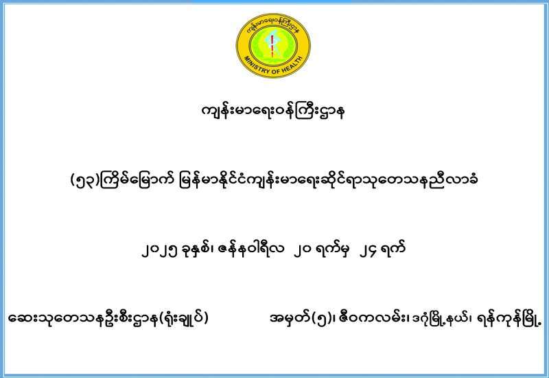 “(၅၃) ကြိမ်မြောက် မြန်မာနိုင်ငံ ကျန်းမာရေးဆိုင်ရာ သုတေသနညီလာခံ” ကို “ကျန်းမာသောဘဝပိုင်ဆိုင်ဖို့ ကျန်းမာရေးပြဿနာများဖော်ထုတ်ဖြေရှင်းကြပါစို့ - Moving Forward to a Healthy Lifestyle and Addressing Health Risk Behaviors” ဟူသော ဆောင်ပုဒ်နှင့် ဇန်နဝါရီ ၂၀ ရက်မှ ၂၄ ရက်အထိ ရန်ကုန်မြို့ ဒဂုံမြို့နယ် အမှတ်- ၅၊ ဇီဝကလမ်းရှိ ဆေးသုတေသနဦးစီးဌာန (ရုံးချုပ်) ၌ ကျင်းပမည်ဖြစ်သည်။
