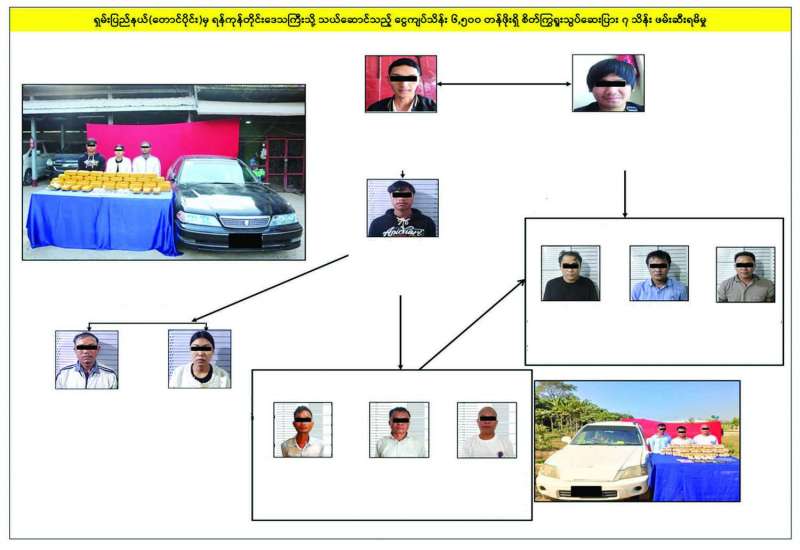 မူးယစ်ဆေးဝါးတားဆီးနှိမ်နင်းရေးရဲတပ်ဖွဲ့မှ တပ်ဖွဲ့ဝင်များပါဝင်သော ပူးပေါင်းအဖွဲ့သည် ဇန်နဝါရီ ၄ ရက် ညနေ ၅ နာရီခွဲအချိန် သတင်းအရ တောင်ကြီးမြို့နယ် တောင်လေးလုံးကျေးရွာအနီး၌ တောင်ကြီးမှအောင်ပန်းဘက်သို့ ဟန်လင်းကျော်မောင်းနှင်ပြီး မယွန်းသီရိကျော်လိုက်ပါလာသည့် TOYOTA MARK II ယာဉ်ပေါ်မှ စိတ်ကြွရူးသွပ်ဆေးပြားလေးသိန်း ဖမ်းဆီးရမိခဲ့ကြောင်း၊ သတင်းကွင်းဆက်အရ ဇန်နဝါရီ ၅ ရက်နံနက် ၁၁ နာရီအချိန် မန္တလေးတိုင်းဒေသကြီး သာစည်မြို့နယ် ကျွဲတပ်ဆုံကျေးရွာအနီး၌ တောင်ကြီးမှ ရန်ကုန်သို့ ဇော်ဇော်အောင် (ခ) ထက်အောင် မောင်းနှင်ပြီး သန်းထွန်းနှင့် ကျော်ဝင်း (ခ) ဘလိတို့ လိုက်ပါလာသည့် CRV မော်တော်ယာဉ်ပေါ်မှ စိတ်ကြွရူးသွပ်ဆေးပြားသုံးသိန်း ဖမ်းဆီးရမိခဲ့သည်။