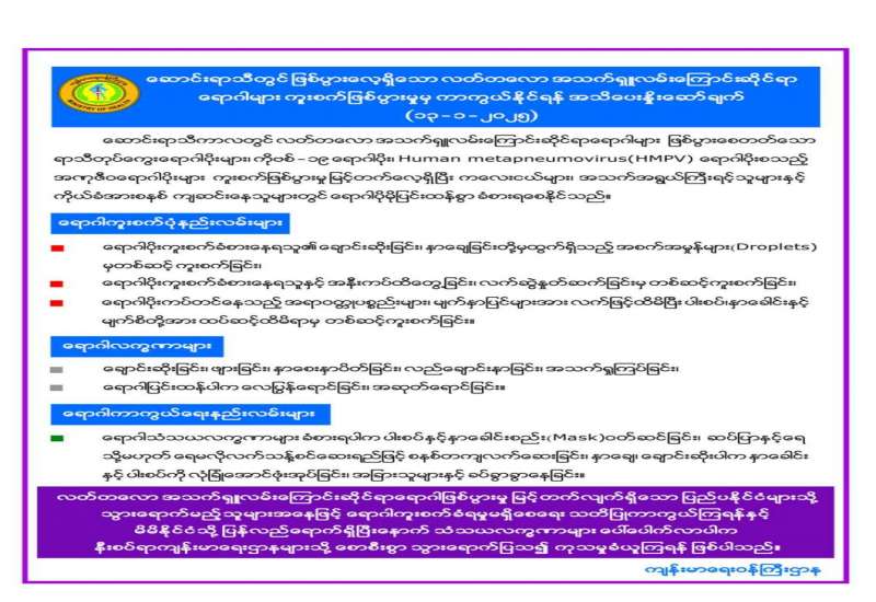 ဆောင်းရာသီတွင်ဖြစ်ပွားလေ့ရှိ လတ်တလော အသက်ရှူလမ်းကြောင်းဆိုင်ရာရောဂါများ ကူးစက်ဖြစ်ပွားမှုမှ ကာကွယ်နိုင်ရန် အသိပေးနှိုးဆော်ချက်