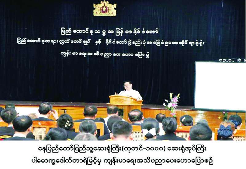 ပြည်ထောင်စုတရားလွှတ်တော်ချုပ်နှင့် နိုင်ငံတော်ဖွဲ့စည်းပုံ အခြေခံဥပဒေဆိုင်ရာခုံရုံးမှ ဝန်ထမ်းများ ကျန်းမာရေးဆိုင်ရာ အသိပညာနှင့်ဗဟုသုတများ တိုးပွားရရှိပြီး ကျန်းမာကြံ့ခိုင်စွာဖြင့် လုပ်ငန်းတာဝန်များ ထမ်းဆောင်နိုင်စေရန်ရည်ရွယ်၍ ကျန်းမာရေးဝန်ကြီးဌာနနှင့် ပြည်ထောင်စု တရားလွှတ်တော်ချုပ်တို့ ပူးပေါင်းစီစဉ်သည့် ကျန်းမာရေးအသိပညာပေး အစီအစဉ်အရ ဆီးချို၊ သွေးချို၊ သွေးတိုးနှင့် သွားကျန်းမာရေးဆိုင်ရာ ဟောပြောပွဲကို ယနေ့မွန်းလွဲပိုင်းတွင် နေပြည်တော်ရှိ ပြည်ထောင်စုတရားလွှတ်တော်ချုပ် စုဝေးခန်းမ၌ ကျင်းပသည်။