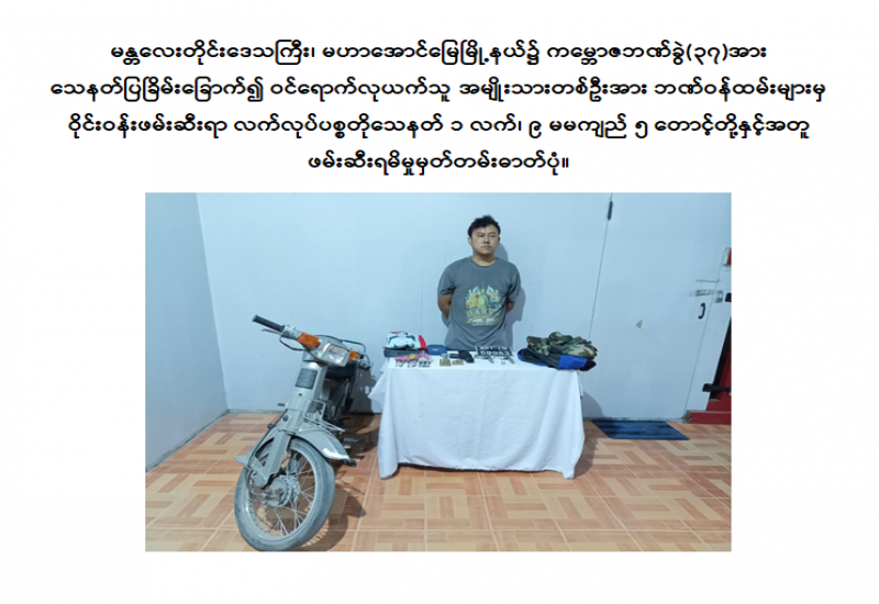 ၂၀၂၅ ခုနှစ်၊ ဇန်နဝါရီလ ၁၁ ရက်နေ့ မွန်းလွဲ ၂ နာရီ ၃၅ မိနစ်တွင် မန္တလေးတိုင်းဒေသကြီး၊ မဟာအောင်မြေမြို့နယ်၊ မဟာနွယ်စဉ်ရပ်ကွက်၊ လမ်း ၄၀ ၊ ၇၂ လမ်းနှင့် ၇၃ လမ်းကြားရှိ ကမ္ဘောဇဘဏ်ခွဲ (၃၇) ၌ လုယက်မှုဖြစ်ပွားကြောင်း သတင်းအရ လုံခြုံရေးတပ်ဖွဲ့ဝင်များက သွားရောက်စစ်ဆေးခဲ့ရာ အဆိုပါကမ္ဘောဇဘဏ်ခွဲ (၃၇) အတွင်းသို့ ပြောက်ကျားအင်္ကျီလက်ရှည်၊ ဘောင်းဘီရှည် အနက်ရောင်ဝတ်ဆင်ထားသူ အမျိုးသားတစ်ဦး (စိစစ်ဆဲ) က