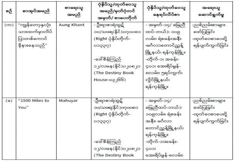 ၁။ ပြန်ကြားရေးဝန်ကြီးဌာနသည် ၂၀၁၄ ခုနှစ် ပုံနှိပ်ခြင်းနှင့်ထုတ်ဝေခြင်းလုပ်ငန်းဥပဒေ၊ နည်းဥပဒေများနှင့်အညီ ပုံနှိပ်ခြင်းလုပ်ငန်း၊ ထုတ်ဝေခြင်းလုပ်ငန်းများကို ကြီးကြပ်ဆောင်ရွက်လျက်ရှိပါသည်။ ထိုသို့ဆောင်ရွက်လျက်ရှိရာတွင် အောက်ဖော်ပြပါ ပုံနှိပ်သူနှင့် ထုတ်ဝေသူများသည် ပုံနှိပ်ခြင်းနှင့် ထုတ်ဝေခြင်းလုပ်ငန်းဥပဒေပုဒ်မ ၈၊ ပုဒ်မခွဲ (ဂ) ပါ ညစ်ညမ်းစာများကို ဖော်ပြခြင်း စည်းကမ်းချက်ကို ဖောက်ဖျက်၍ ဟီရိဩတ္တပ္ပကင်းသော၊ မြန်မာ့လူ့အဖွဲ့အစည်းက လက်မခံသော၊လူငယ်များ၏ တွေးခေါ်မြော်မြင်မှုနှင့်ခံစားနားလည်မှုကို လွဲမှားစေနိုင်သောအကြောင်းအရာများကို ပုံနှိပ်၊ ထုတ်ဝေဖြန့်ချိခဲ့ကြောင်း တွေ့ရှိရပါသည်-