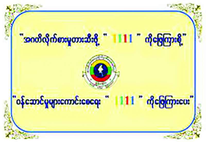 ၁။ ပြည်သူ့စစ်မှုထမ်းဆင့်ခေါ်ရေးဆိုင်ရာ ကိစ္စရပ်များနှင့်စပ်လျဉ်း၍ သိရှိလိုသည်များကို စုံစမ်းမေးမြန်းရန်နှင့် သတင်းပို့ရန်တို့အတွက် တိုင်းဒေသကြီးနှင့် ပြည်နယ်အသီးသီးရှိ ပြည်သူ့စစ်မှုထမ်းဆင့်ခေါ်ရေးအဖွဲ့များ၏ အောက်ပါဖုန်းနံပါတ်များသို့ ရုံးချိန်အတွင်း ဆက်သွယ်နိုင်ပါကြောင်း ထုတ်ပြန်အပ်ပါသည်-