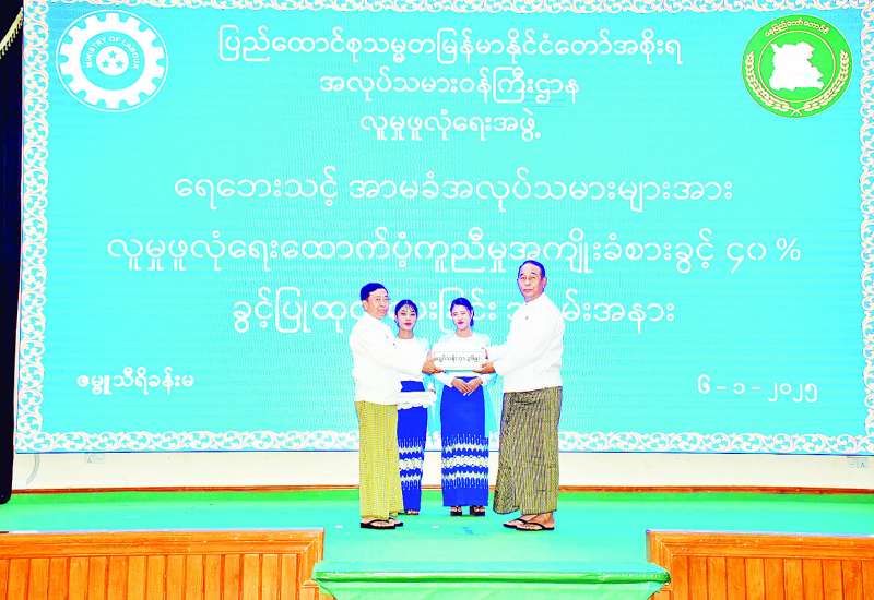 ပြည်ထောင်စုနယ်မြေအတွင်း အကျုံးဝင်မှတ်ပုံတင်ထားသော အလုပ်ဌာနများမှ ရေဘေးသင့်အာမခံအလုပ်သမားများအား လူမှုဖူလုံရေးထောက်ပံ့ကူညီမှု အကျိုးခံစားခွင့် ၄၀ ရာခိုင်နှုန်း ခွင့်ပြုထုတ်ပေးရန် နေပြည်တော်ကောင်စီဥက္ကဋ္ဌထံ ပေးအပ်ခြင်းအခမ်းအနားကို ယနေ့နံနက်ပိုင်းတွင် နေပြည်တော်ကောင်စီ ဇမ္ဗူသီရိခန်းမ၌ ကျင်းပသည်။