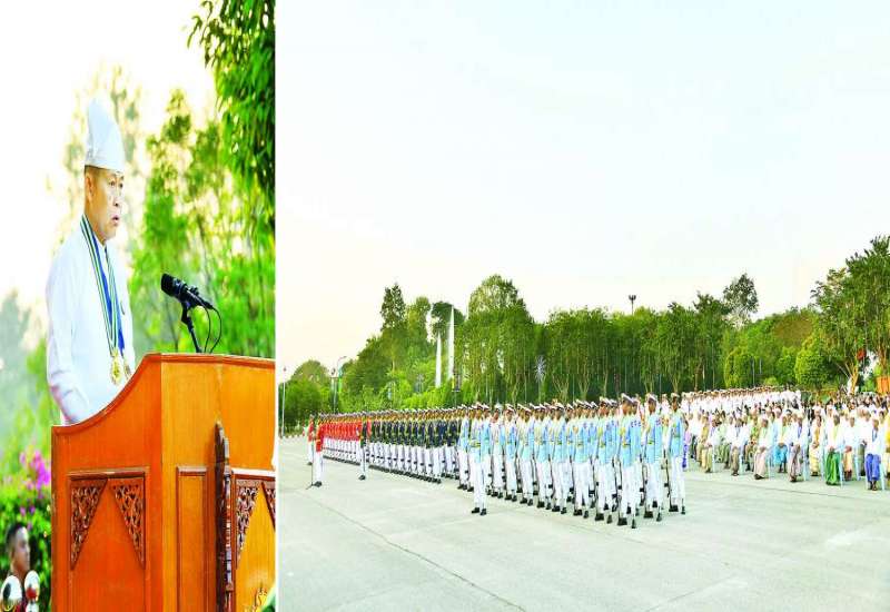 (၇၇) နှစ်မြောက် လွတ်လပ်ရေးနေ့အထိမ်းအမှတ် ဂုဏ်ထူးဆောင်ဘွဲ့များ ချီးမြှင့်အပ်နှင်းခြင်းအခမ်းအနားကို ယနေ့နံနက်ပိုင်းတွင် နိုင်ငံတော်စီမံအုပ်ချုပ်ရေးကောင်စီဥက္ကဋ္ဌရုံး သဘင်ဆောင်၌ကျင်းပရာ နိုင်ငံတော်စီမံအုပ်ချုပ်ရေးကောင်စီဥက္ကဋ္ဌ နိုင်ငံတော်ဝန်ကြီးချုပ် ဗိုလ်ချုပ်မှူးကြီးသတိုးမဟာသရေစည်သူ သတိုးသီရိသုဓမ္မ မင်းအောင်လှိုင် တက်ရောက်အမှာစကားပြောကြားပြီး ဂုဏ်ထူးဆောင်ဘွဲ့များ ချီးမြှင့်အပ်နှင်းသည်။