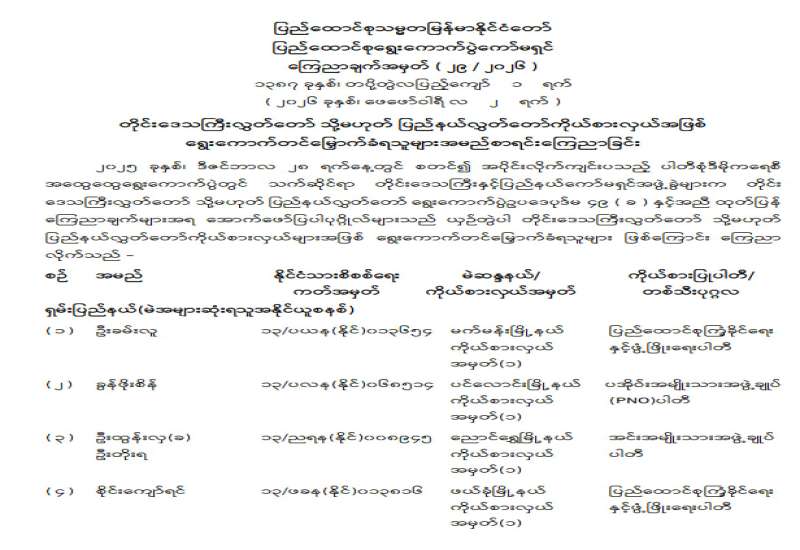 တိုင်းဒေသကြီးလွှတ်တော် သို့မဟုတ် ပြည်နယ်လွှတ်တော်ကိုယ်စားလှယ်အဖြစ် ရွေးကောက်တင်မြှောက်ခံရသူများ အမည်စာရင်းကြေညာခြင်း