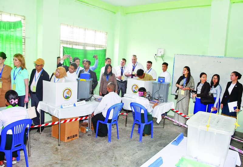 နိုင်ငံတကာရွေးကောက်ပွဲစောင့်ကြည့်လေ့လာရေးအဖွဲ့များနှင့် ပြည်တွင်းအခြေစိုက် နိုင်ငံတကာသံရုံးများမှ သံတမန်များ၊ တာဝန်ရှိသူများသည် ယနေ့တွင် ပါတီစုံဒီမိုကရေစီအထွေထွေရွေးကောက်ပွဲ အပိုင်း (၃) ကျင်းပနေသည့် ရန်ကုန်မြို့ရှိ မဲရုံများသို့ သွားရောက်၍ မဲရုံမှူးများ၊ တာဝန်ရှိသူများ၊ မဲဆန္ဒရှင်ပြည်သူများနှင့် တွေ့ဆုံကာ ရွေးကောက်ပွဲနှင့် စပ်လျဉ်း၍ ဆွေးနွေးလေ့လာစောင့်ကြည့်မှုများ ပြုလုပ်ကြသည်။