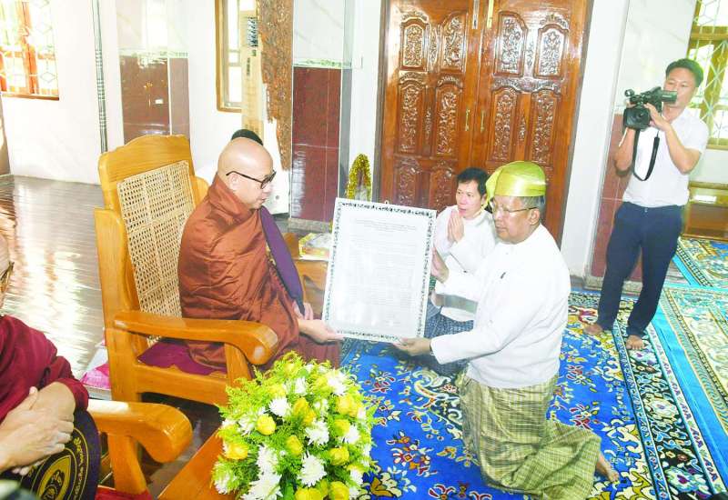 (၇၈) ကြိမ်မြောက် တိပိဋကဓရ တိပိဋကကောဝိဒ ရွေးချယ်ရေး စာမေးပွဲတွင် တိပိဋကဓရ တိပိဋကကောဝိဒ (၁၈)ပါးမြောက် ဘွဲ့တံဆိပ်တော်မြတ် ရရှိတော်မူသည့် ဘဒ္ဒန္တဝိစိတ္တသာရ ဆရာတော်ထံသို့ ပြည်ထောင်စုသမ္မတမြန်မာနိုင်ငံတော် ယာယီသမ္မတ နိုင်ငံတော်လုံခြုံရေးနှင့်အေးချမ်းသာယာရေးကော်မရှင်ဥက္ကဋ္ဌ ဗိုလ်ချုပ်မှူးကြီး သတိုးမဟာသရေစည်သူ သတိုးသီရိသုဓမ္မ မင်းအောင်လှိုင်ထံမှ ဆက်ကပ်ပေးပို့သည့် ဂုဏ်ယူဝမ်းမြောက်ကြောင်း သဝဏ်လွှာဆက်ကပ် လှူဒါန်းခြင်းအခမ်းအနားကို ယနေ့နံနက်ပိုင်းတွင် ရန်ကုန်တိုင်းဒေသကြီး ဒဂုံမြို့သစ်(အရှေ့ပိုင်း)မြို့နယ် တိပိဋကမဟာ ဂန္ထဝင်နိကာယ် ကျောင်းတိုက်၌ကျင်းပရာအခမ်းအနားသို့ သာသနာရေးနှင့်ယဉ်ကျေးမှုဝန်ကြီးဌာန ပြည်ထောင်စုဝန်ကြီး ဦးတင်ဦးလွင်၊ ရန်ကုန်တိုင်းဒေသကြီးဝန်ကြီးချုပ် ဦးစိုးသိန်း၊ တိုင်းဒေသကြီးအစိုးရအဖွဲ့ဝင်ဝန်ကြီးများ၊ သာသနာရေးဦးစီးဌာန ညွှန်ကြားရေးမှူးချုပ်နှင့် တာဝန်ရှိသူများ တက်ရောက်ကြည်ညိုကြသည်။