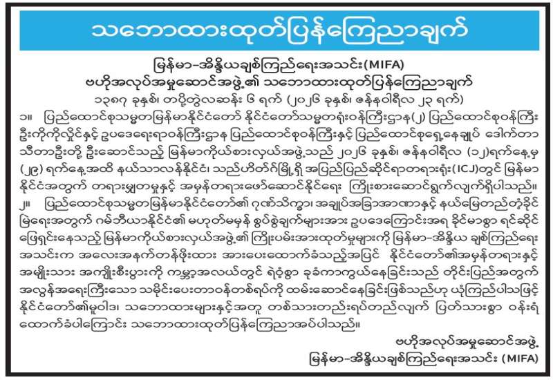 မြန်မာ-အိန္ဒိယချစ်ကြည်ရေးအသင်း (MIFA) ဗဟိုအလုပ်အမှုဆောင်အဖွဲ့၏ သဘောထားထုတ်ပြန်ကြေညာချက်
