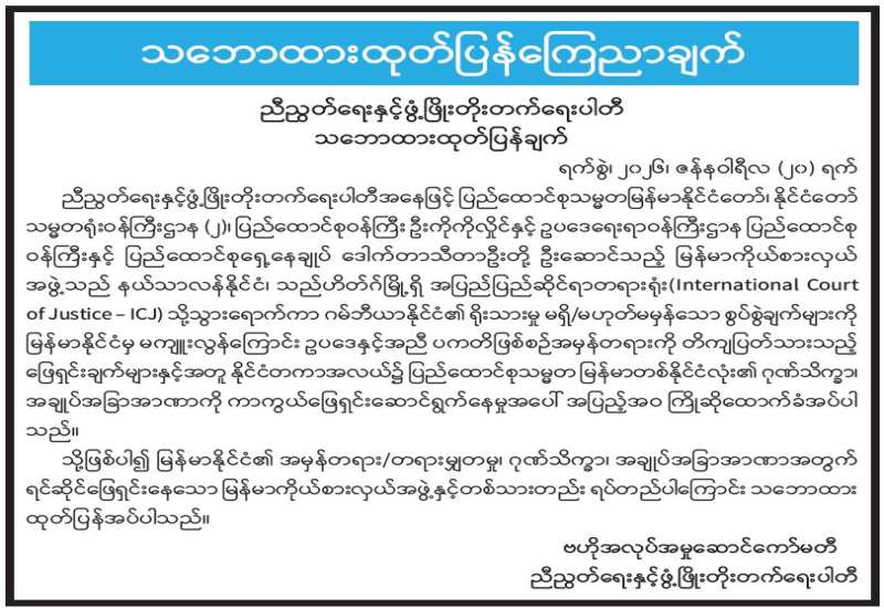 ညီညွတ်ရေးနှင့်ဖွံ့ဖြိုးတိုးတက်ရေးပါတီ သဘောထားထုတ်ပြန်ချက်