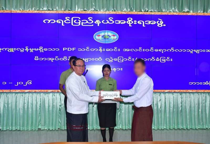 နိုင်ငံတော်အစိုးရသည် PDF အပါအဝင် အဖွဲ့အစည်းအမျိုးမျိုးအမည်ခံ၍ လက်နက်ကိုင်ဆန့်ကျင်လျက်ရှိသည့် အဖွဲ့အစည်းများအတွင်း ရောက်ရှိနေသူများအား ဥပဒေဘောင်အတွင်းသို့ ပြန်လည်ဝင်ရောက်ရန် ဖိတ်ခေါ်၍ ဥပဒေဘောင်အတွင်းသို့ ပြန်လည်ဝင်ရောက်လာကြသူများကိုလည်း လိုအပ်သည့် ကူညီပံ့ပိုးမှုများဆောင်ရွက်ပေးလျက်ရှိရာ နိုင်ငံတော်နှင့် တပ်မတော်၏ ငြိမ်းချမ်းရေးလုပ်ငန်းစဉ်များကို နားလည်သဘောပေါက်လာသည့် PDF အမည်ခံအဖွဲ့ဝင် အမျိုးသား(၅)ဦးတို့သည် လက်နက်၊ ခဲယမ်းများနှင့်အတူ ယနေ့တွင် ဥပဒေဘောင်အတွင်းသို့ ဝင်ရောက်လာကြသည်။