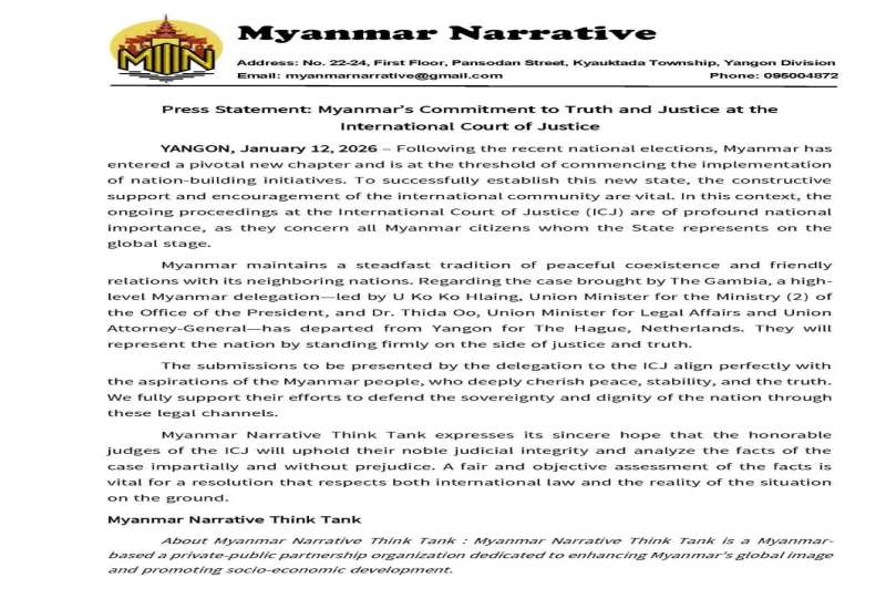ရန်ကုန်မြို့၊ ၂၀၂၆ ခုနှစ်၊ ဇန်နဝါရီလ ၁၂ ရက် – မြန်မာနိုင်ငံသည် ရွေးကောက်ပွဲအပြီးတွင် သမိုင်းစာမျက်နှာအသစ်သို့ ကူးပြောင်းကာ နိုင်ငံတော်သစ် တည်ဆောက်ရေးလုပ်ငန်းစဉ်များကို စတင်ဖော်ဆောင်တော့မည့်အချိန်အခါဖြစ်ပါသည်။ ထိုသို့ နိုင်ငံသစ်တစ်ရပ်ကို အောင်မြင်စွာ တည်ဆောက်နိုင်ရန်အတွက် နိုင်ငံတကာအသိုက်အဝန်း၏ အပြုသဘောဆောင်သော အားပေးကူညီမှုများနှင့် ပူးပေါင်းဆောင်ရွက်မှုများသည် အထူးလိုအပ်လျက်ရှိပါသည်။ လက်ရှိတွင် အပြည်ပြည်ဆိုင်ရာတရားရုံး (ICJ) ၌ ရင်ဆိုင်နေရသော အမှုကိစ္စသည် မြန်မာနိုင်ငံကို ကိုယ်စားပြုသည့်အပြင် မြန်မာပြည်သူအားလုံး၏ အကျိုးစီးပွားနှင့် တိုက်ရိုက်သက်ဆိုင်သည့် ကိစ္စရပ်တစ်ခုလည်း ဖြစ်ပါသည်။