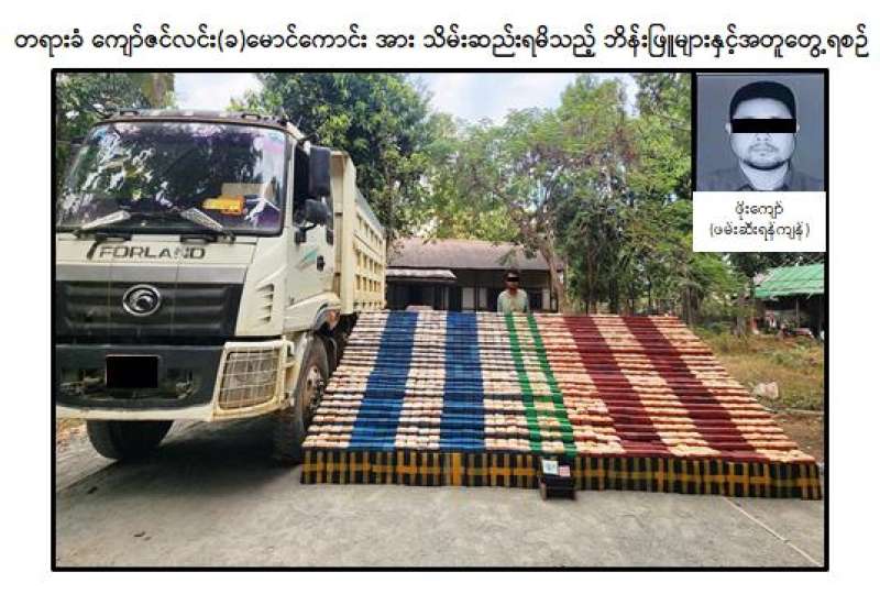 မူးယစ်ဆေးဝါးတားဆီးနှိမ်နင်းရေးရဲတပ်ဖွဲ့မှ တပ်ဖွဲ့ဝင်များပါဝင်သော ပူးပေါင်းအဖွဲ့သည် ဇန်နဝါရီ ၃ ရက် ညနေ ၅ နာရီခွဲက ကလေးဝမြို့နယ်၊ ကလေးဝ-မော်လိုက်သွားကားလမ်း၊ နန်းမော်ကယ်ကျေးရွာအနီးတွင် မော်လိုက်မြို့နယ်၊ နန်းခမ်းပါတ်သစ်တောကြိုးဝိုင်း၊ ပျဉ်းစိုက်ခင်းနေ ကျော်ဇင်လင်း (ခ) မောင်ကောင်း (၂၆) နှစ် မောင်းနှင်လာသော TNI-4 2N-Xxxx FORLAND မော်တော်ယာဉ်အား သတင်းအရ ရပ်တန့်စစ်ဆေးရှာဖွေရာ ယာဉ်ပေါ်မှ ဘိန်းဖြူ ၃၈ ဒသမ ၅ ကီလို (၎င်းဒေသ တန်ဖိုးငွေကျပ် ၁ ဒသမ ၉၂၅ ဘီလီယံ) အား ဖမ်းဆီးရမိခဲ့ပါသည်။