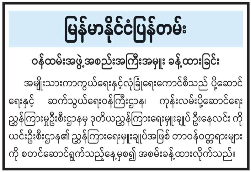 စီမံကိန်းနှင့်မူဝါဒဆိုင်ရာ ချေးငွေထုတ်ချေးရန်စိစစ်ရေးအဖွဲ့ အစည်းအဝေးအမှတ်စဉ် (၁/ ၂၀၂၆) ကို ယနေ့မွန်းလွဲပိုင်းတွင် ပြည်တွင်းအခွန်များဦးစီးဌာန ရုံး အမှတ် (၄၆) ၌ ကျင်းပရာ စိစစ်ရေးအဖွဲ့ဥက္ကဋ္ဌ ဘဏ္ဍာရေးနှင့်အခွန်ဝန်ကြီးဌာန ပြည်ထောင်စုဝန်ကြီး ဒေါက်တာကံဇော်၊ အဖွဲ့ဝင်များဖြစ်ကြသည့် ဒုတိယဝန်ကြီး ဒေါ်သန်းသန်းလင်း၊ ဥပဒေရေးရာဝန်ကြီးဌာန ဒုတိယဝန်ကြီး ဒေါက်တာ ထိန်လင်းဦး၊ မြန်မာ နိုင်ငံတော်ဗဟိုဘဏ် ဒုတိယဥက္ကဋ္ဌ ဒေါက်တာလင်းအောင်နှင့်ဌာနဆိုင်ရာ တာဝန်ရှိသူများတက်ရောက်ကြသည်။