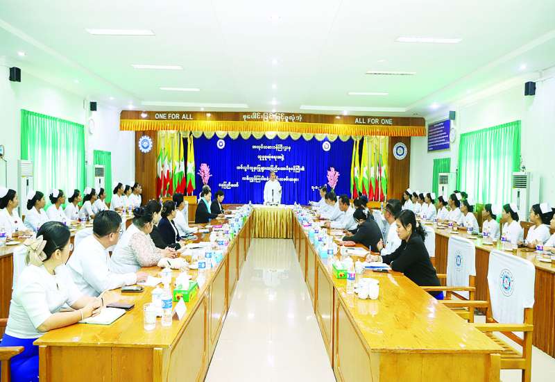 ကျန်းမာရေးဝန်ကြီးဌာနမှ အလုပ်သမားဝန်ကြီးဌာန လူမှုဖူလုံရေးအဖွဲ့သို့ ခန့်အပ်တာဝန်ပေးအပ်ခဲ့သည့် သစ်လွင်သူနာပြုများကို အလုပ်သမားဝန်ကြီးဌာန ပြည်ထောင်စုဝန်ကြီးက တွေ့ဆုံပွဲကို ယနေ့နံနက်ပိုင်းတွင် လူမှုဖူလုံရေးအဖွဲ့ရုံးချုပ် စုဝေးခန်းမ၌ကျင်းပရာ ပြည်ထောင်စုဝန်ကြီး ဦးအောင်ကျော်ဟိုး၊ ဒုတိယဝန်ကြီး၊ ညွှန်ကြားရေးမှူးချုပ်များ၊ ဆေးရုံအုပ်ကြီးများနှင့် တာဝန်ထမ်းဆောင်မည့် သစ်လွင်သူနာပြုများ တက်ရောက်ကြသည်။